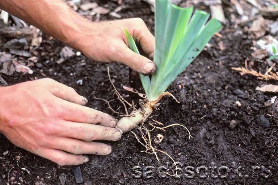 Посадку проводят так, чтобы само корневище находилось в горизонтальном положении, а листовой веер в вертикальном. У бородатых ирисов после посадки корневище должно находиться на уровне почвы, его нельзя ни заглублять, ни сажать высоко.