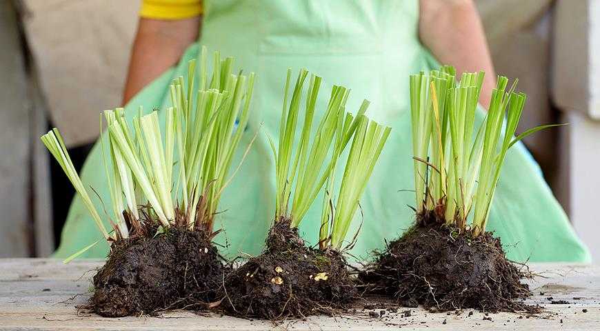 Сама процедура разделения не слишком сложная. У куртины нужно обрезать листья до 1/3 высоты и выкопать кусты с как можно большим сохранением земляного кома. Осмотрев корневище, намечают будущие деленки, оставляя в каждой по 3-8 вееров. Участки аккуратно отделяют от выкопанного растения острым ножом или лопатой и как можно быстрее переносят на новое место. Для ирисов допустима подсушка корневищ, но в таком случае перед их высадкой следует замочить их в воде до полного восстановления тканей. Проводят предпосадочное вымачивание от нескольких часов до 2-4 суток.