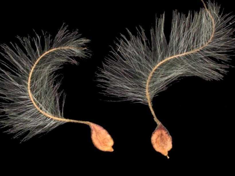 Форма семян довольно интересная. Это маленький своеобразный орешек, имеющий с одной стороны длинную беловато-серебряную летучку, а с другой – небольшое заострение. Летучка позволяет переноситься ветром на значительное расстояние, а благодаря заострению семена легко закапываются в грунт.