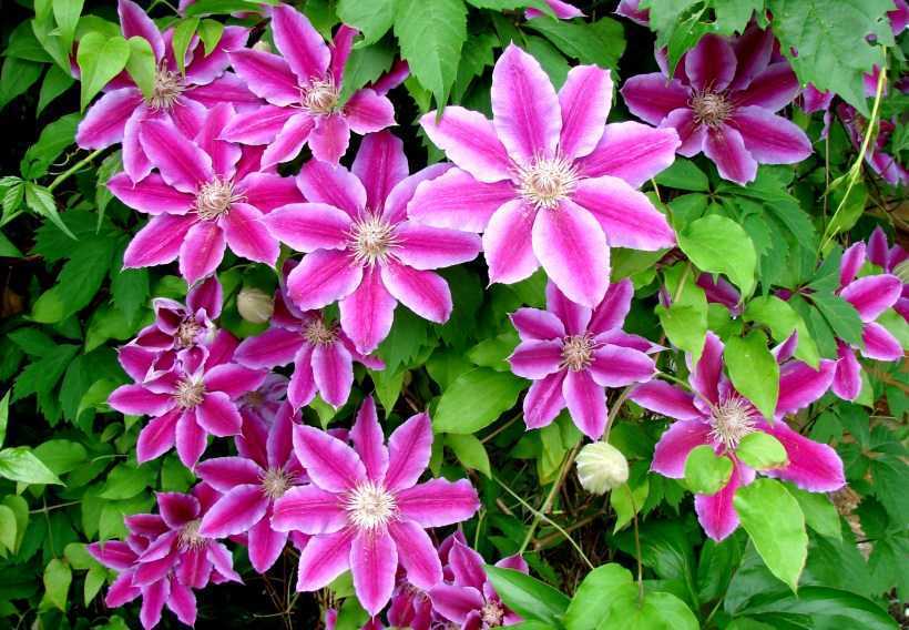 Клематисы Женни (цветки мелковаты, но сорт цветет обильно), Президент и Кетлин Дандфорд.