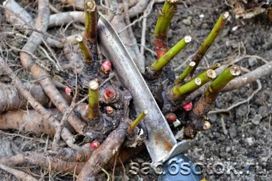 - острым ножом или секатором куст делится так, чтобы на корне саженца было минимум 3-4 сильных почки, при этом стараются сберечь, как можно больше молодых корешков, выросших от корневища;