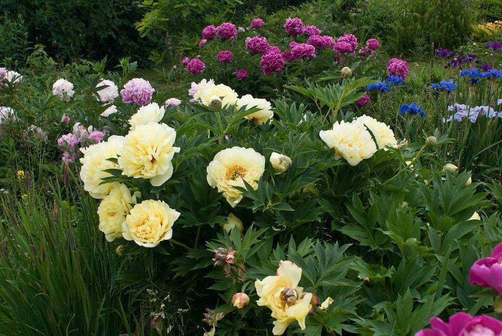 Хорошо смотрятся бордюры и садовые дорожки, обсаженные желтыми пионами. Меняя растения-спутники, можно каждый год получать новый дизайн.