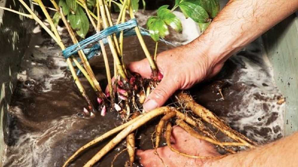 Так, его надо очень осторожно выкопать вместе с комом земли, который затем аккуратно смывается не очень сильной струей воды. Потом надо провести осмотр корневой системы. Если есть гнилые корешки, то их следует обрезать, а чересчур длинные при этом укорачивают