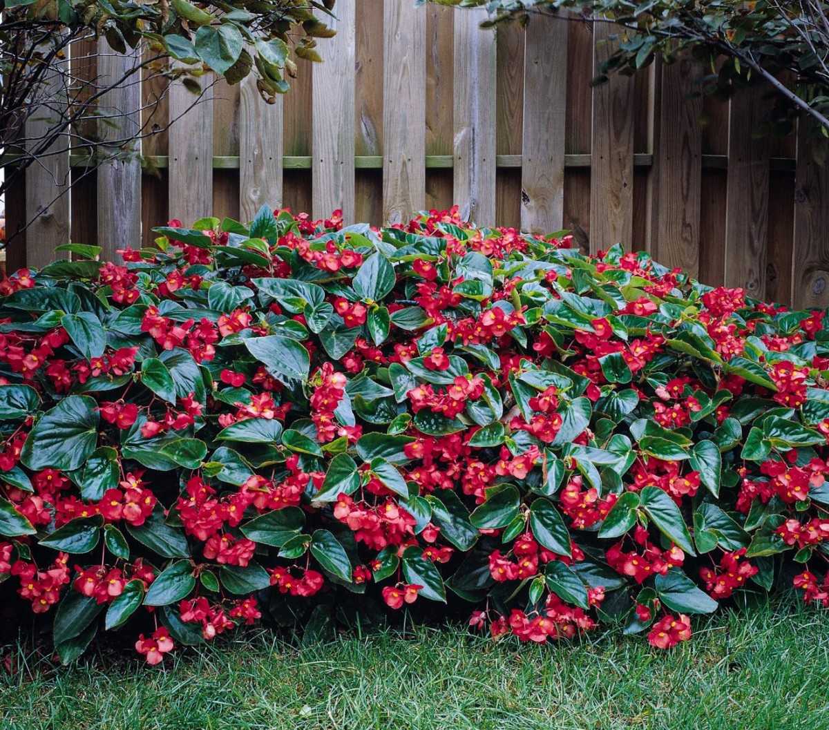 - Бегония – вечноцветущее растение дополняет цветы, которые любят тень. Яркие оттенки цветов красиво пестрят в подвесных горшках, на клумбах и грядках. Произрастает небольшими компактными кустами, поэтому для красивой картинки требуется групповое высаживание.