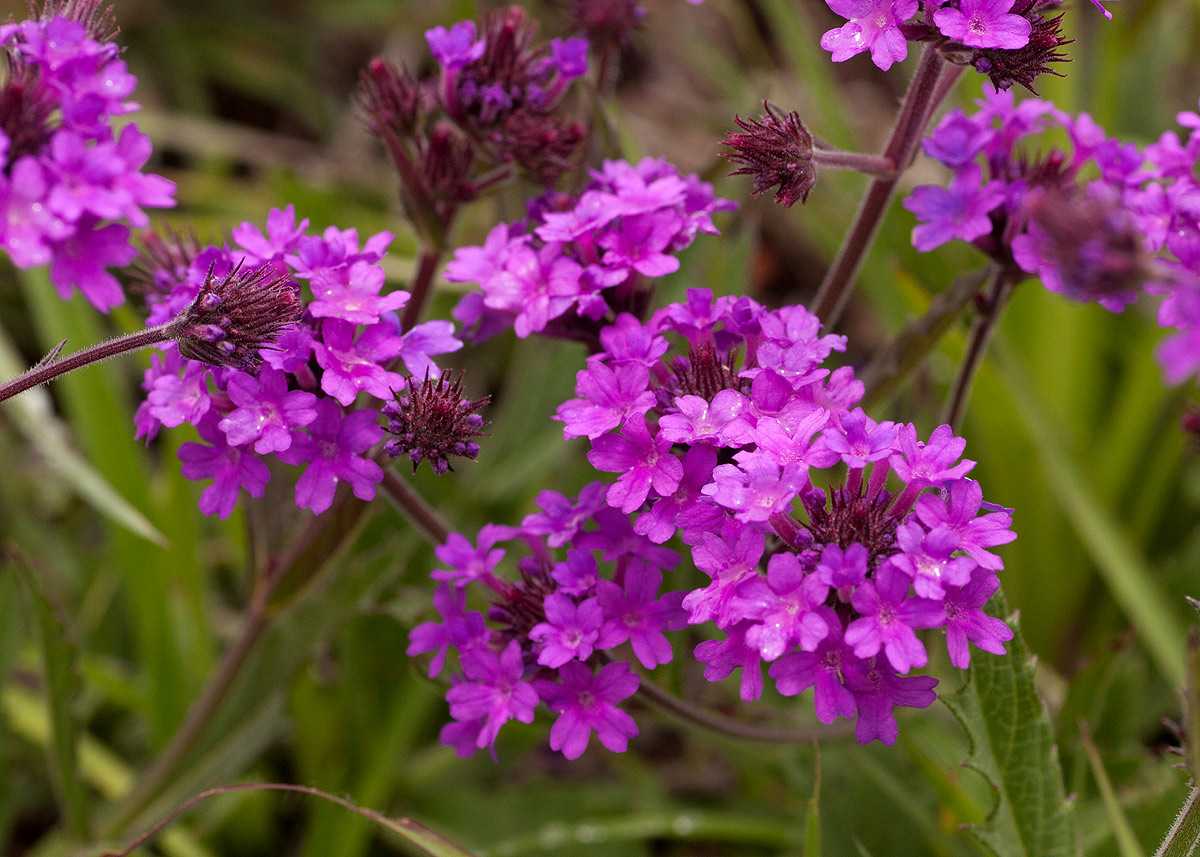 Verbena bonariensis (буэнос-айресская). Дикорастущие виды являются многолетниками. Их кусты имеют жёсткие прямые стебли, которые достигают высоты 100—120 см. Листья, имеющие формы ланцета с зубчатым краем, располагаются на стебле в супротивном порядке. Мелкие фиолетовые цветки собраны в плотный зонтик. Отличается продолжительным и обильным цветением.