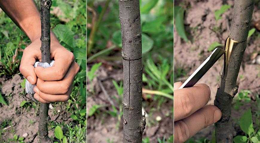 На подвое зачистите от веток и листьев место, где будете проводить окулировку, и протрите его влажной тряпкой (1). Сделайте т-образный надрез (2). Отогните кору (3).