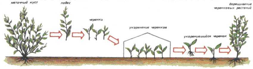 Разведение зелеными черенками можно проводить с куста не моложе 5-6 лет. Нарезают под углом отрезки длиной 10-15 см с двумя парами листов и точкой роста. Черенки сразу ставят в воду, а затем выдерживают в растворе гетероауксина (3%). Перед посадкой нижние листья убирают, черенки промывают, высаживают в грунт и закрывают пленкой на 4-5 недели до полного укоренения. Черенки периодически увлажняют и проветривают.