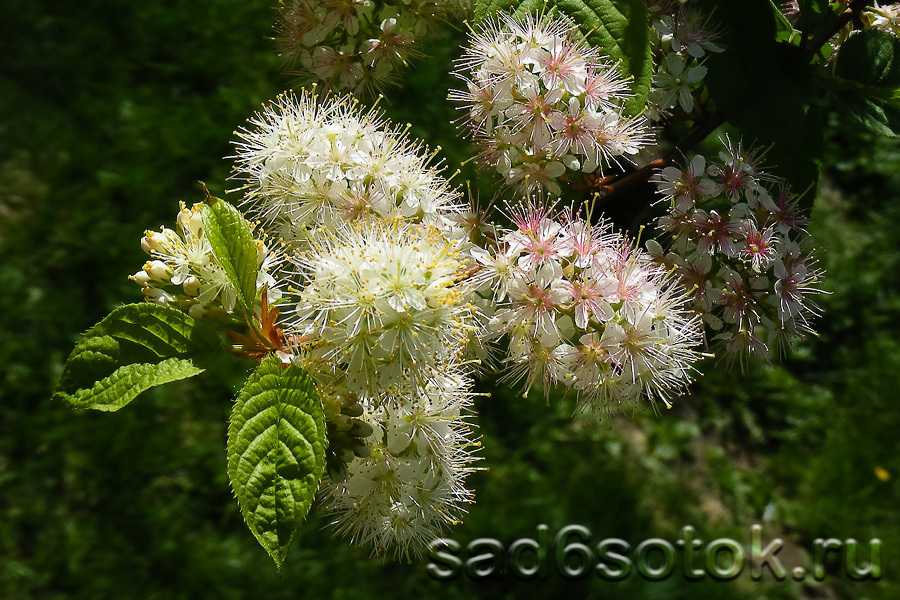 Цветки белые или с розовым оттенком, небольшого размера, образуют соцветия-щитки. Эта культура очень красива во время цветения, особенной привлекательностью обладают формы с махровыми цветками. Плохо подходит для выращивания в нашем климате.