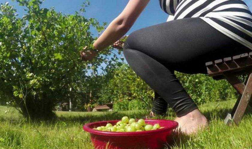 Собирают урожай крыжовника постепенно, по мере созревания ягод. Кладут плоды в небольшие контейнеры или маленькие вёдра. В каждой ёмкости должно быть не более 2 кг продукции, иначе ягоды подавятся.