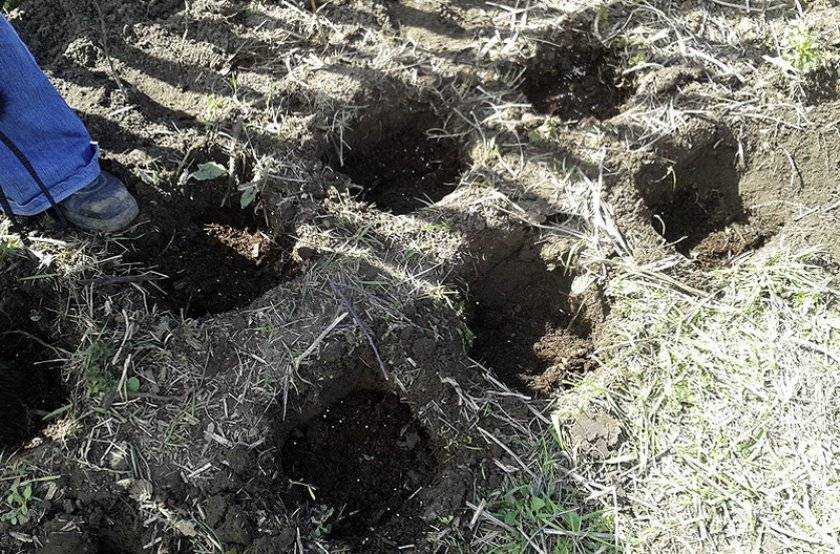 Вдоль шпалеры выкапывается траншея глубиной 50 см, шириной 60 см. Боковины обкладывают ненужными кусками оцинкованного железа, старым шифером, досками, препятствующими поросли выбраться в междурядья. Над землей ограждение должно выступать на 20-25 см. Дно устилается перегноем – слой 5 см, с добавлением древесной золы – на 1 ведро литровая банка.