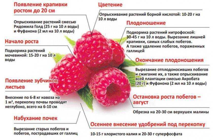 В первый год после посадки малине достаточно питательных веществ, заложенных в яму. Со второго вегетативного сезона начинают активные подкормки по следующей схеме: