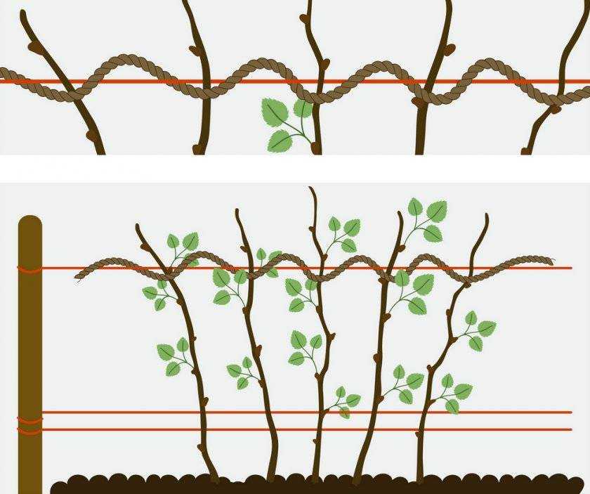 Для роста и правильного развития растение нуждается в подвязке. Так как кусты довольно мощные и высокие, выбранная опора также должна отличаться надежностью. Малина, высаженная в траншеи, нуждается в шпалерной подвязке. Шпалера, как правило, натягивается на столбы, расположенные по краям ряда.