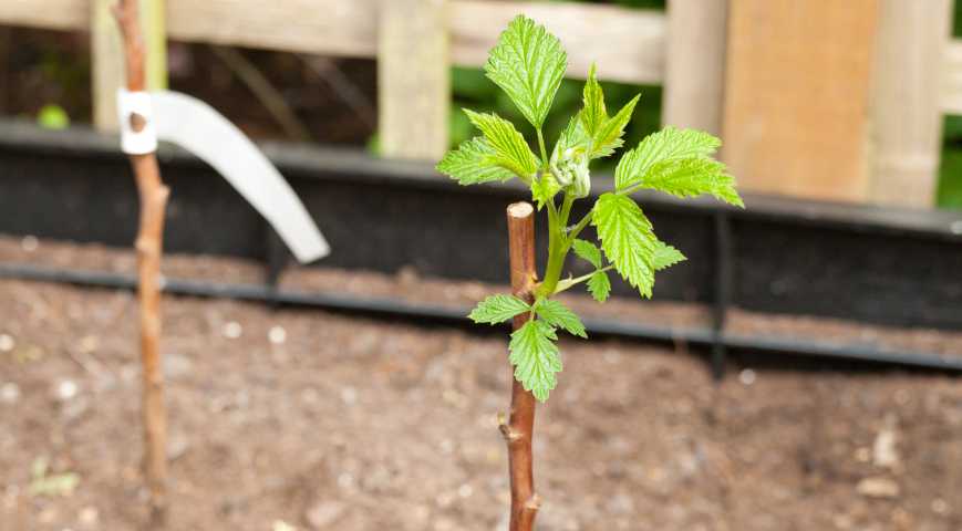 Молодые саженцы подвязывают к одному ряду натянутой проволоки, а по мере роста малины добавляют следующие ряды.