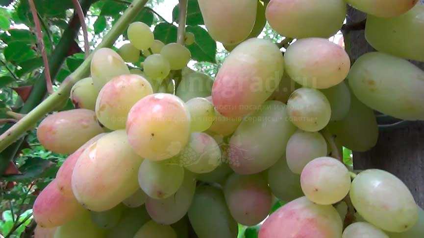 - Окрас у винограда очень красивый, в процессе созревания он изменяется с бело-палевого до насыщенного желто-розового цвета. В состоянии полной зрелости цвет становится ярко-розовым.