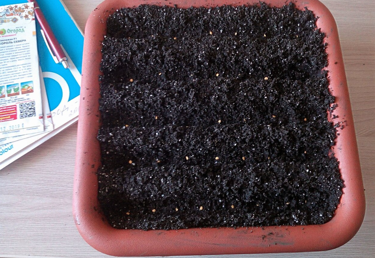 Рассказываю, как проявил себя Король севера на моем участке. Судя по характеристикам, сорт очень ранний. Тем не менее, в наших условиях выращивать баклажаны приходится через рассаду. Я посеяла свои семена в конце марта, но думаю, что и в начале апреля не сильно запоздала бы. Сеяла в контейнер, который наполнила землей, заготовленной с осени и хорошо проморозившейся за зиму.