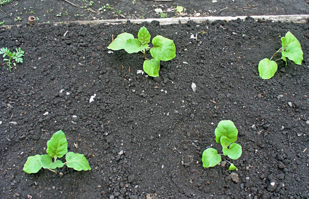 Через 3-4 дня, когда проклюнутся ростки, высаживают баклажаны в почву, на расстоянии 5 см друг от друга. В лунку сажают 1-3 семечка, слабые ростки потом удаляют. Используют специальные контейнеры, горшочки из прессованного торфа или просто горшки для цветов. Грунт перед посадкой обязательно прожаривают в духовом шкафу.
