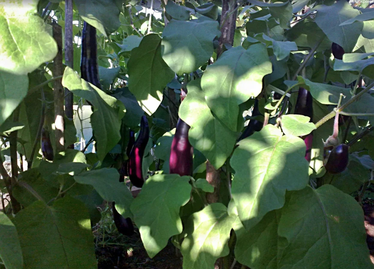 На первое время саженцы укрывала спанбондом – не столько от холода, сколько от ветра и яркого солнца. Все они успешно прижились, достигли в высоту 60–70 см (в теплице более 100 см, их пришлось подвязывать). В июле растения зацвели и начали плодоносить. Баклажаны завязывались в ОГ до конца августа, в теплице – до середины сентября. С каждого куста сняли до 10 плодов длиной 30–40 см.