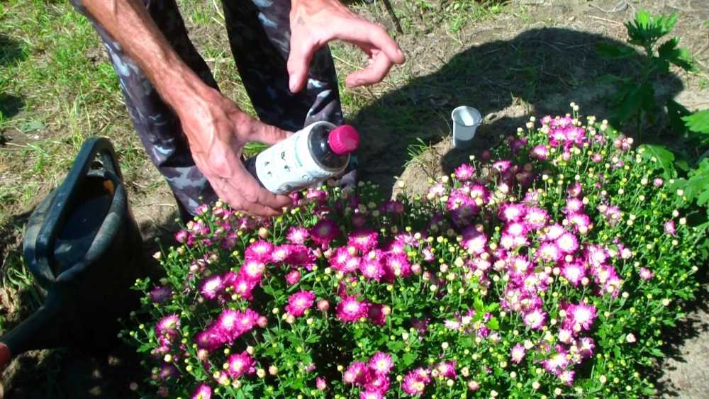 В процессе вегетации хризантемы подкармливают комплексными удобрениями для цветущих растений. Они содержат сбалансированное количество макро- и микроэлементов и направлены на улучшение декоративных качеств.