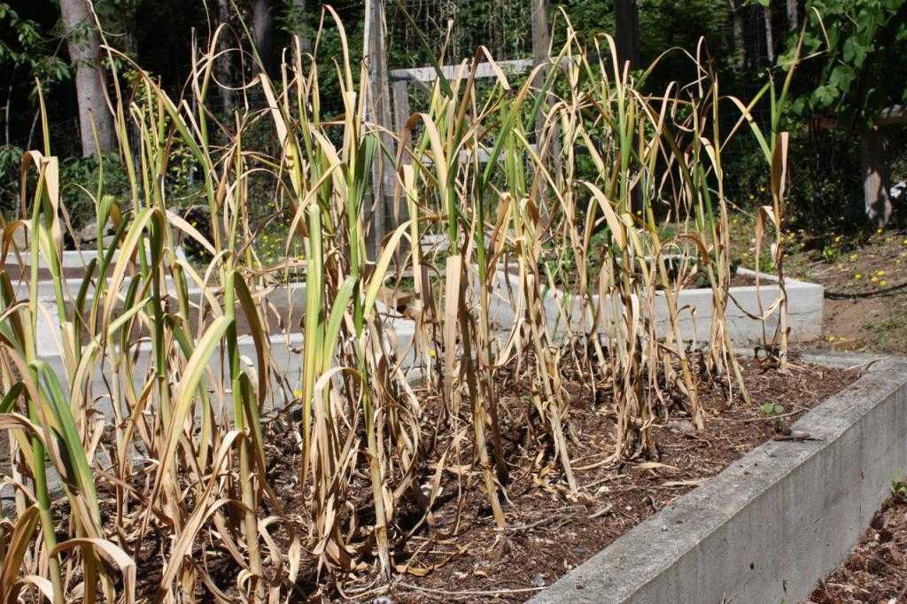 Если ботва растения полностью легла на землю, то время на уборку чеснока, к сожалению, упущено.