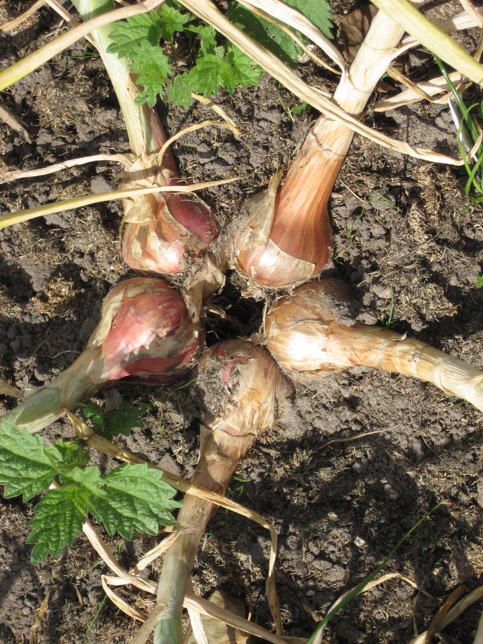 Лук-шалот убирают в сухую солнечную погоду, когда у него поляжет 50-70% зеленой массы. Луковицы следует выкопать вместе с листьями, после чего хорошо просушить на солнце в течение 2 недель.