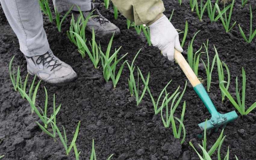Уход за растениями чеснока состоит в систематических рыхлениях на небольшую глубину (4-5 см), чтобы не повредить корневую систему, в уничтожении сорняков, поливах и подкормке.