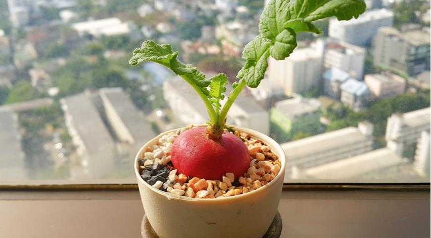В квартире редис плохо растет, если неправильно выбран сорт. Редко кто выращивает эту культуру даже в теплице, поскольку редис предпочитает открытый грунт. Редису не нужна высокая температура, сухой воздух, но нужно наличие специального спектра освещения (16-18 тыс.люкс), хороший и рыхлый питательный грунт, температура не выше 22 °C, равномерное увлажнение воздуха. Выбирайте стрессоустойчивые сорта, скороспелые, компактные, с мягкой ботвой (она содержит больше витаминов, чем корнеплод). Сортотип выбирайте с круглым корнеплодом, чтобы не выпирал над емкостью. Мы можем порекомендовать гибриды F1 Прометей и F1 Гера. Но необходимо использовать фитолампы либо выращивать с мая по сентябрь на подоконнике, равномерно поворачивая к свету. При посевах не частите, кладите одно семечко в одну лунку, сохраняя шаг между растениями 6-7 см, глубина заделки — 1,5 см. Подкормки не нужно, сейте в заправленный торф со слабокислой реакцией.