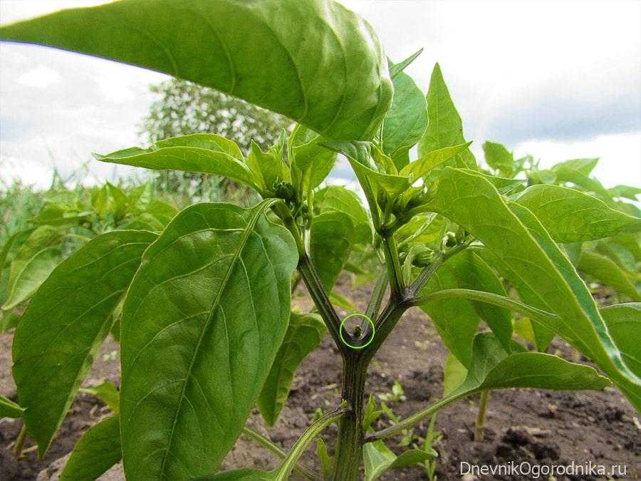 Первый цветок в развилке стеблей и все боковые побеги, кроме двух-четырех, удаляют до высоты 1 м. Лепестки венчика с завязавшихся плодов тоже необходимо удалять — так можно уберечь перцы от поражения завязей серой гнилью.