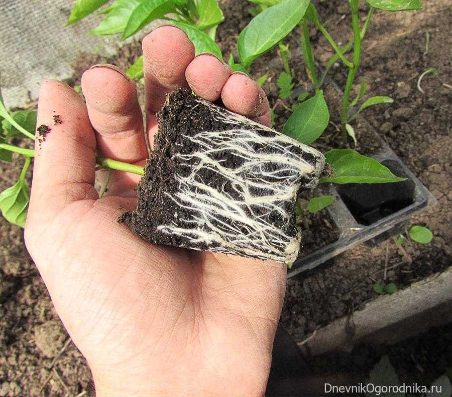 Перцы высаживала, как и томаты, углубляя почти до макушки: по принципу, что будут образовываться дополнительные боковые корни. Но с этой культурой правильней так: в подготовленной перекопанной земле формируем лунки чуть больше земляного кома с рассадой, на дно кладём столовую ложку золы или комплексного удобрения, поливаем водой и сажаем перец так, как он и рос в горшке, не утапливая корневую шейку. Затем мульчируем соломой, сухой травой или компостом.