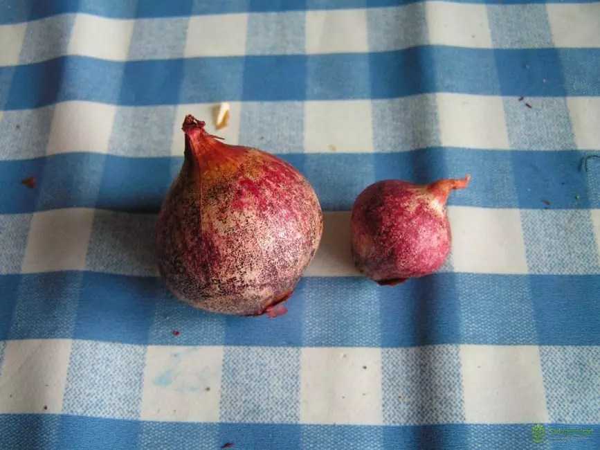 Луковицы крупные, средний вес от 180 до 220 г. Форма немного вытянутая, шейка луковицы тонкая. Луковые чешуйки плотные, желто-коричневого оттенка.